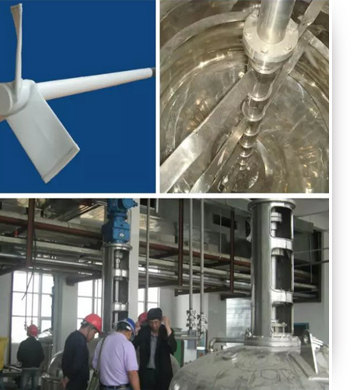脫色罐:主要攪拌目的是物料輕輕攪動脫色,低轉速大直徑的轉動,不能使物料大范圍的攪拌以破壞脫色效果。使用的槳葉形式有:斜葉槳式(XJ、HJ、QJ等)。